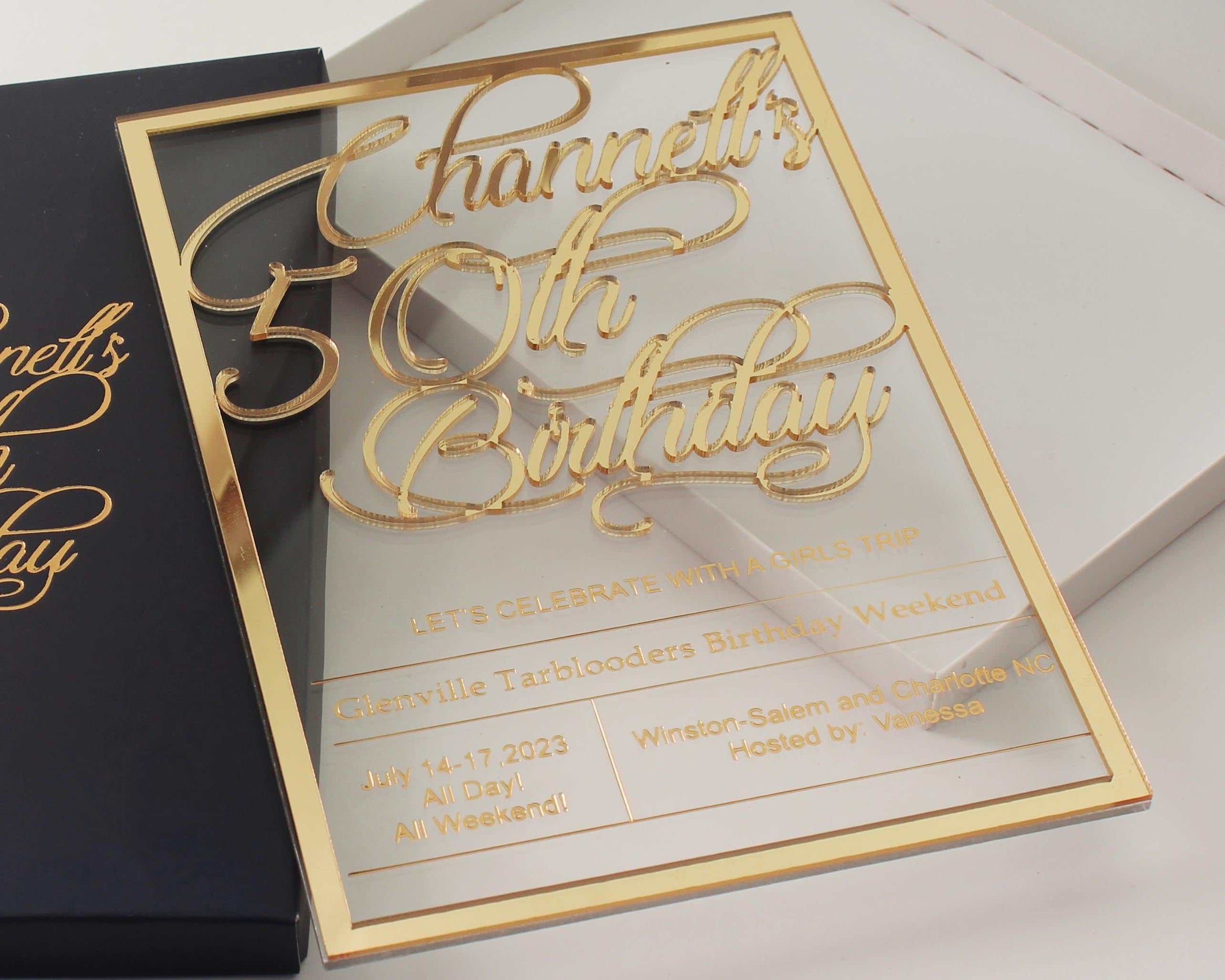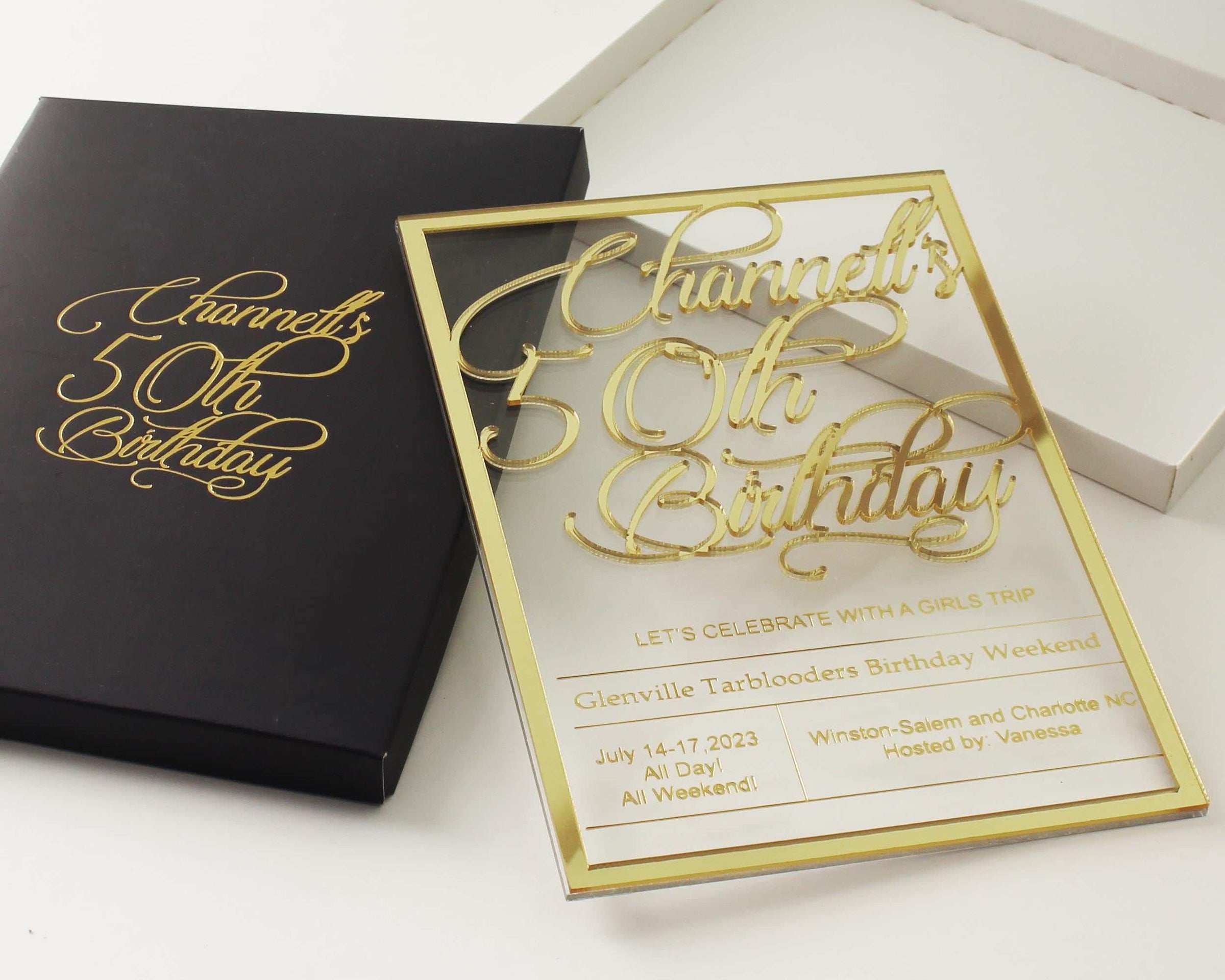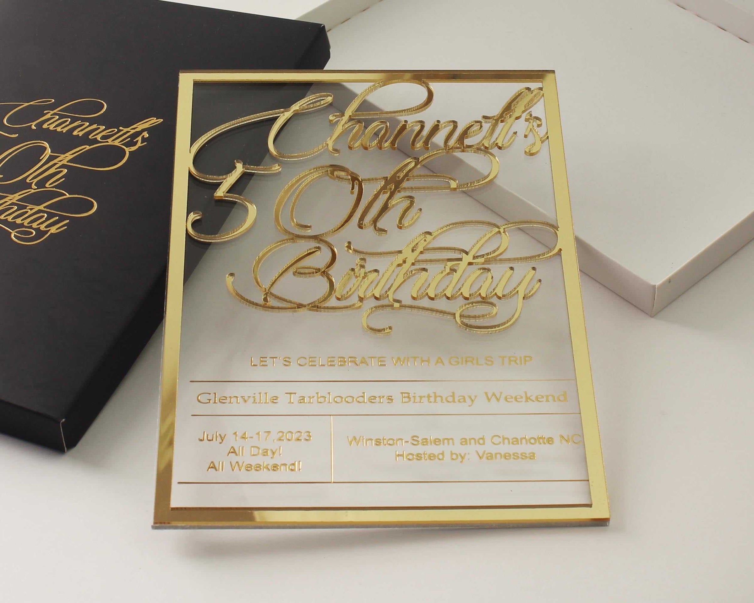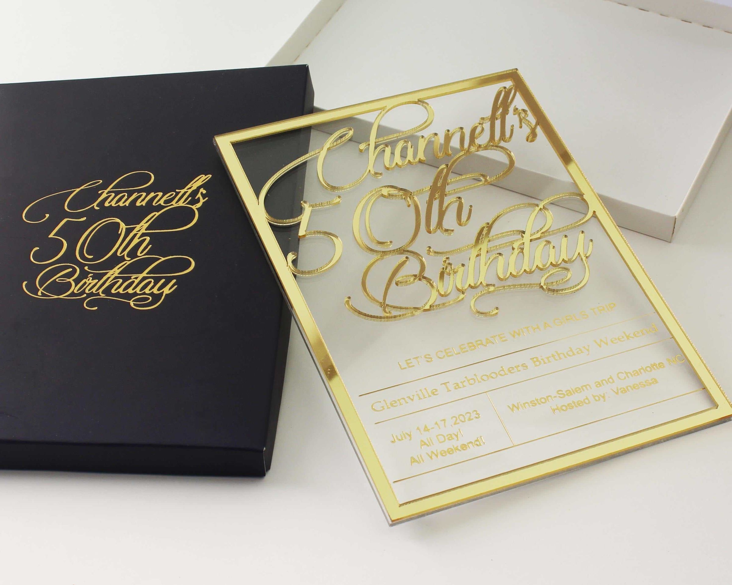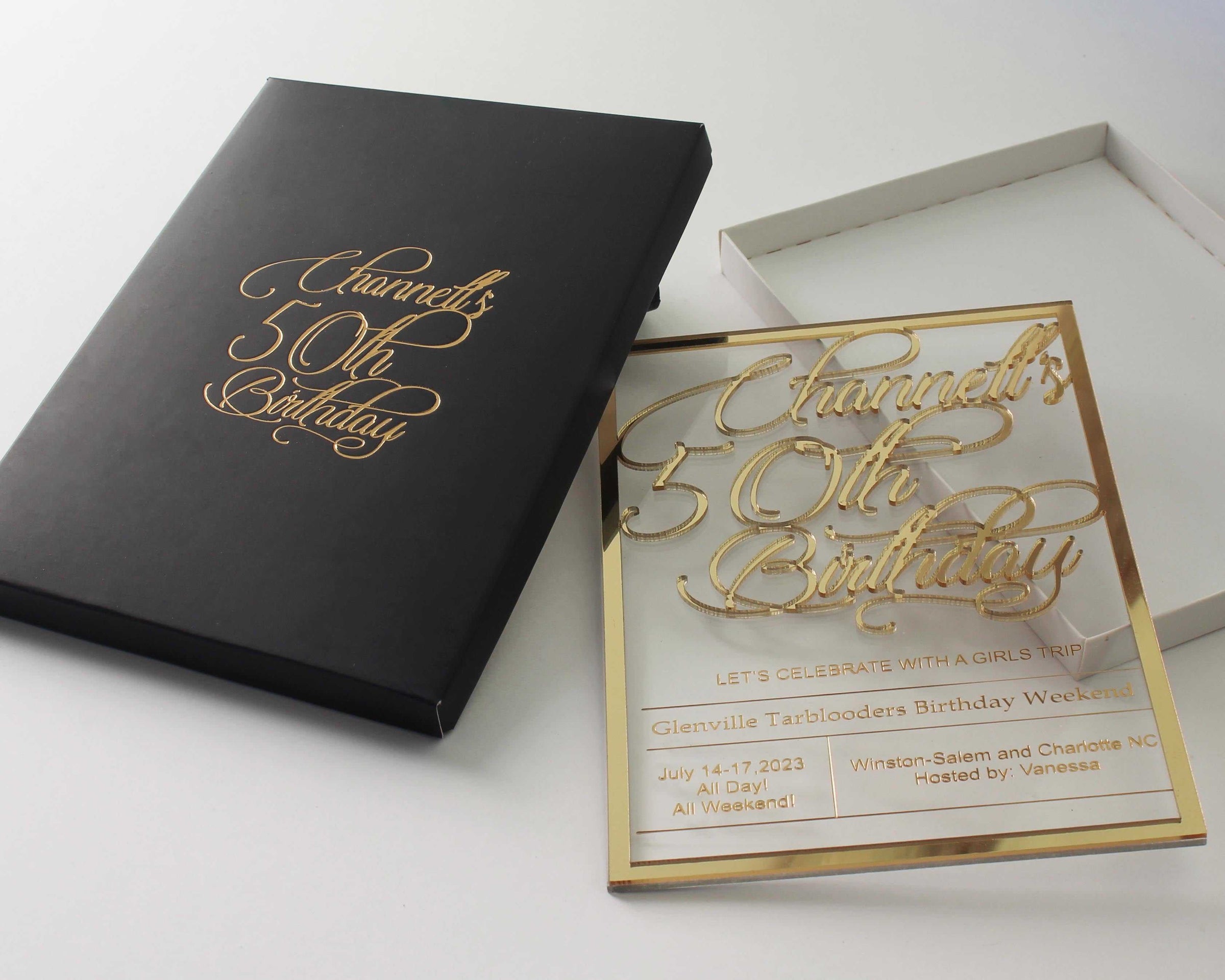 The invitation is made by laminating 2 mm transparent plexiglass and 1.8 mm mirrored plexiglass.